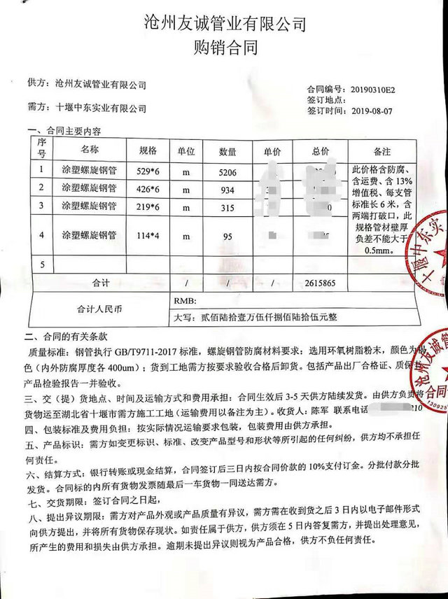 湖北十堰中東實業有限公司與我公司簽訂的管廊工程用內外涂塑復合鋼管合同,我公司確保質量為原則,保障工期為根本,贏得了客戶的好評,通過我們不斷的努力十堰管廊工程我們又合作的另外兩個標段。