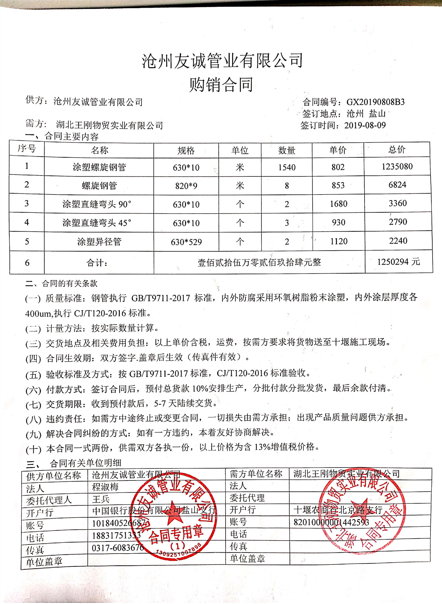 2019年8月9日我公司與湖北王剛物貿實業有限公司簽署購銷合同,市政管廊工程用DN600涂塑復合鋼管1540米及配套管件,我公司專業于涂塑復合鋼管領域,目前國內多地區的管廊工程建設,給排水管道多用于涂塑復合鋼管,今后我們多重視于產品質量,提高服務!
